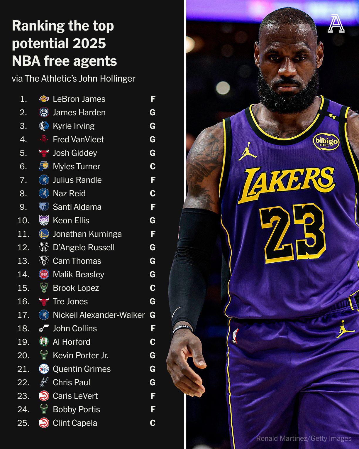 雷速体育6月16日讯 The Athletic专栏作家John Hollinger对2025年休赛期顶级自由球员进行排名,勒布朗和哈登领衔。